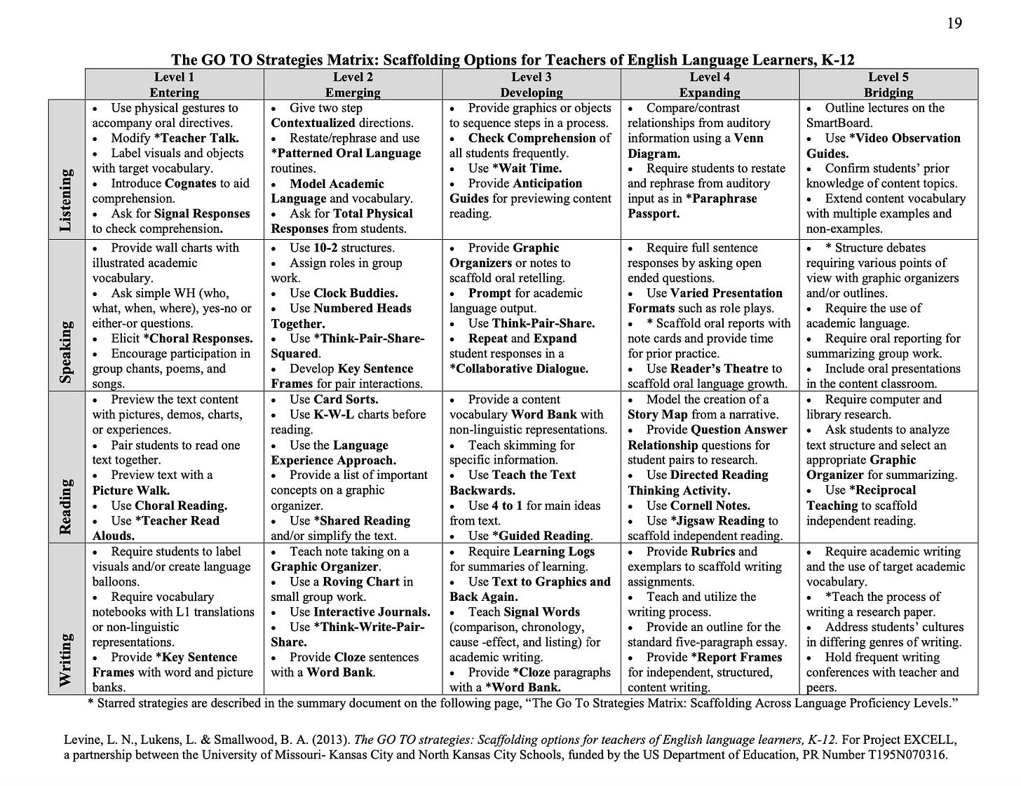Levine, L. N., Lukens, L., & Smallwood, B. A. (2010). The GO TO Strategies Matrix: Scaffolding Options for Teachers of English Language Learners, K-12. Project EXCELL.